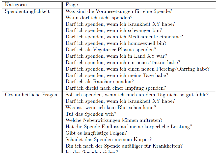 The chatbot´s most important task is answering questions. In order to determine the relevant content I used the insights gained during the analysis phase and conducted research on the websites of different plasma donation services in Germany and Austria. 69 questions from these resources were categorised to be used later for the implementation of the chatbot.