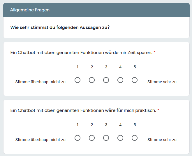 I first created an online survey in order to find out how users search for information on the topic of plasma donations and how this process can be improved by a chatbot. The 240 participants were also asked about their desired features and their willingness to use such a chatbot.